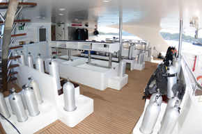 At the rear of the luxury liveaboard boat is a large dive deck which can accommodate up to 28 divers, and provides ample space for guests to move around comfortably. The dive deck includes eleven large rinse tanks of various sizes for varying camera setups. A boat deck is slightly aft of the dive deck where two 5.5 meter diving skiffs are always ready and accessible for divers to board.